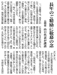 一、公明党は、天皇陛下・皇后陛下が本日まで、お一つお一つのご公務について、全身全霊をもって成し遂げられたご意志を尊び、ここに改めて、わが国と世界の人々の幸福と平和のためにまい進することをお誓い申し上げます。