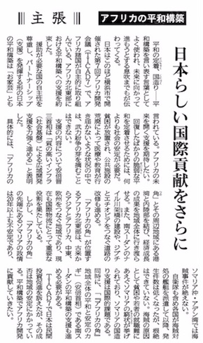 援助が必要な国の自主性を尊重し、パートナーシップ(支援)を発揮する形の日本の平和構築は「お家芸」とも言われている。アフリカの未来を開く支援を期待したい。