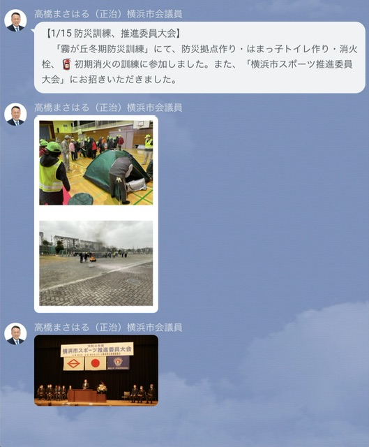 「霧が丘冬期防災訓練」にて、防災拠点作り・はまっ子トイレ作り・消火栓、🧯初期消火訓練に参加しました。また「横浜市スポーツ推進委員大会」にお招きいただきました。 ほっけない! 高橋まさはる(正治) LINE公式アカウント